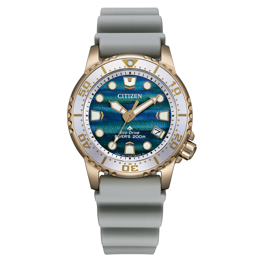 El reloj Diver’s Eco Drive 200 mt Limited Edition de la colección Promaster cuenta con una caja de acero, 11,6mm. de grosor con fondo y corona cerrados a rosca. Correa de caucho biomass. Bisel giratorio unidireccional. Cristal mineral plano. Esfera structural color green. Luminous en agujas, Ãndices y punto en bisel. WR 20 bar.